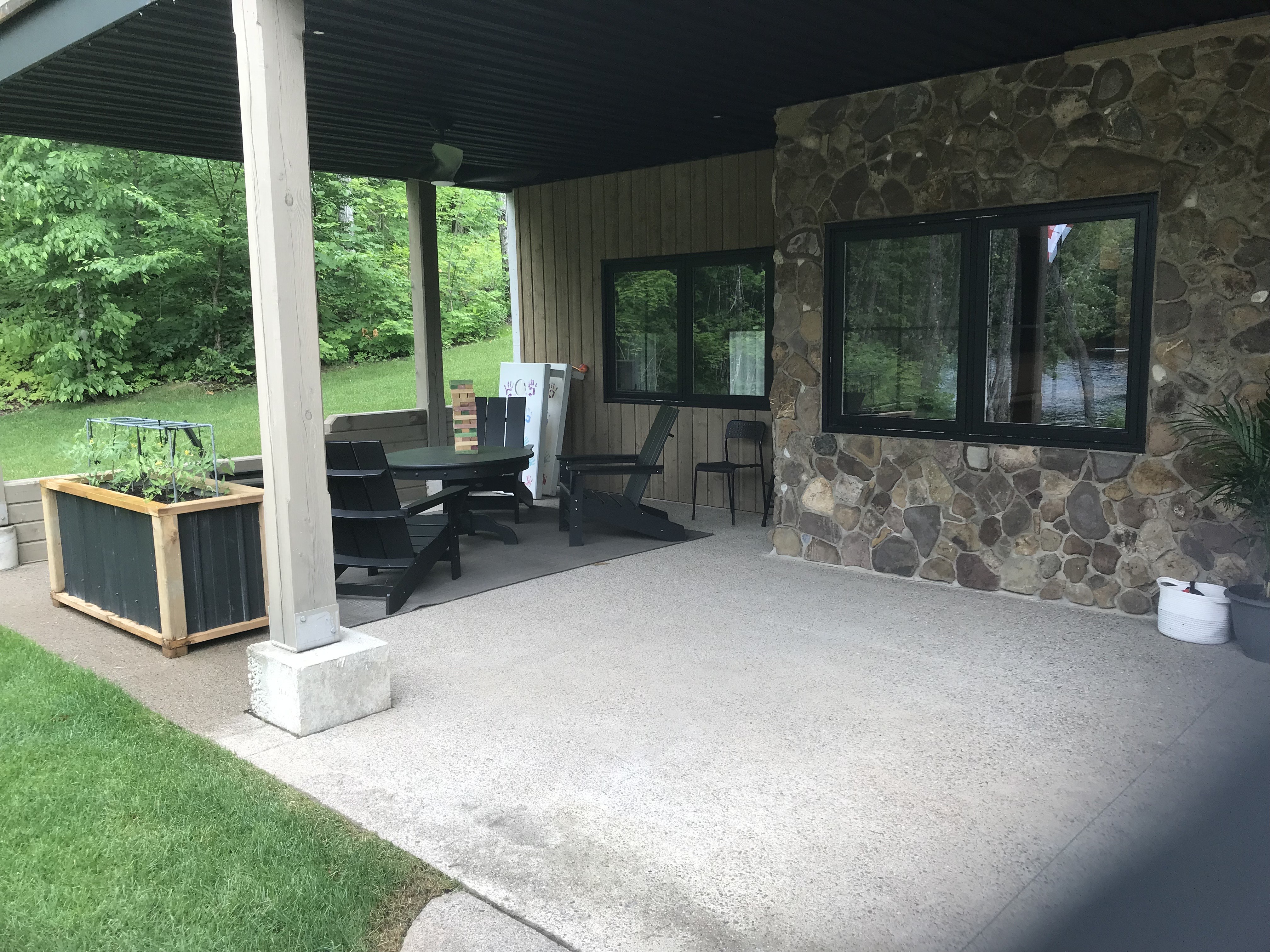 - Propane firepit + yard games (bean bag toss)
